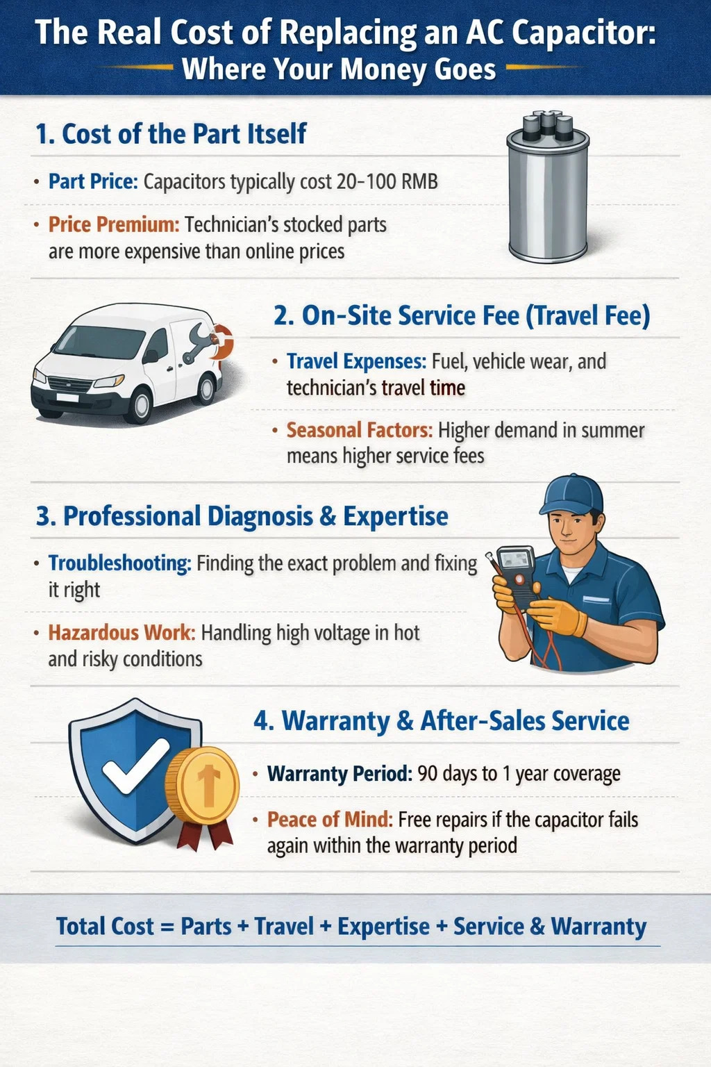 Hvor mye koster det egentlig å bytte en AC-kondensator? Mange ser at små metallbokser selges for bare noen få titalls yuan på nettet, men reparatørens regning kommer på flere hundre yuan, noe som gjør dem urolige.