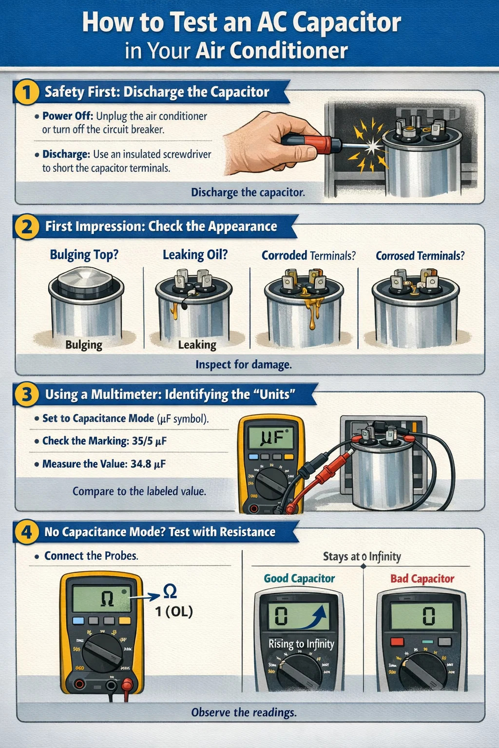 Å avgjøre om en AC-kondensator i et klimaanlegg er bra eller dårlig krever ikke profesjonell elektronikkteknikk. Så lenge du har et multimeter med "kapasitanstest"-funksjon, kan du følge disse trinnene og selv bli semi-ekspert.