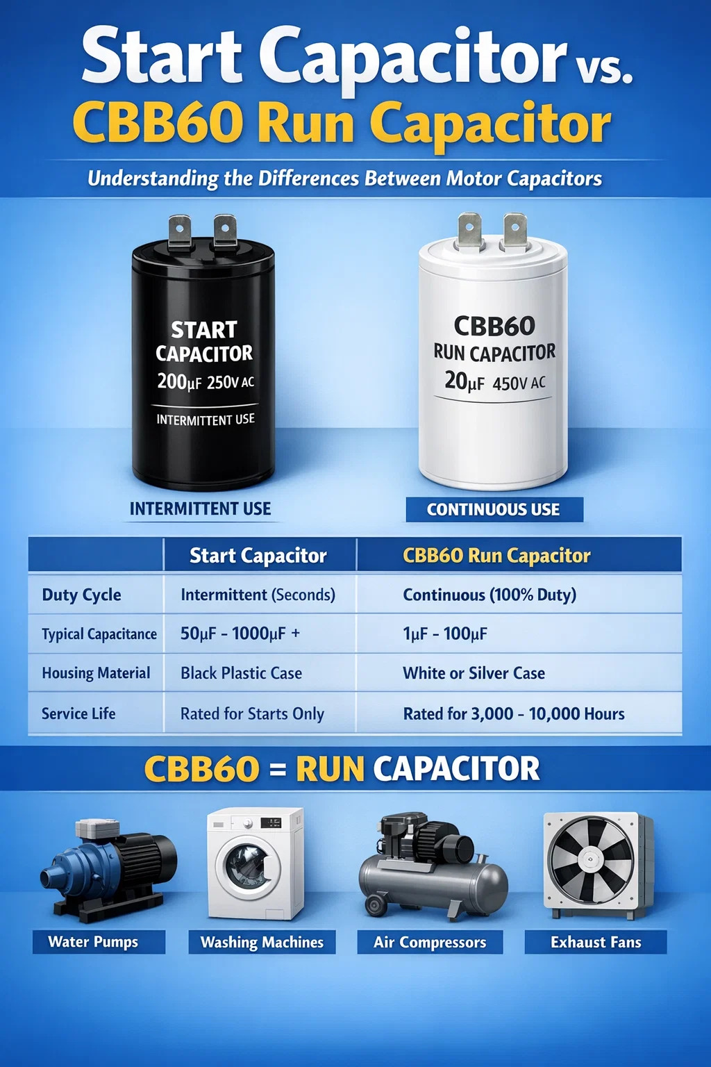 Funksjonelle forskjeller: Start kondensator vs. CBB60 Kjør kondensator