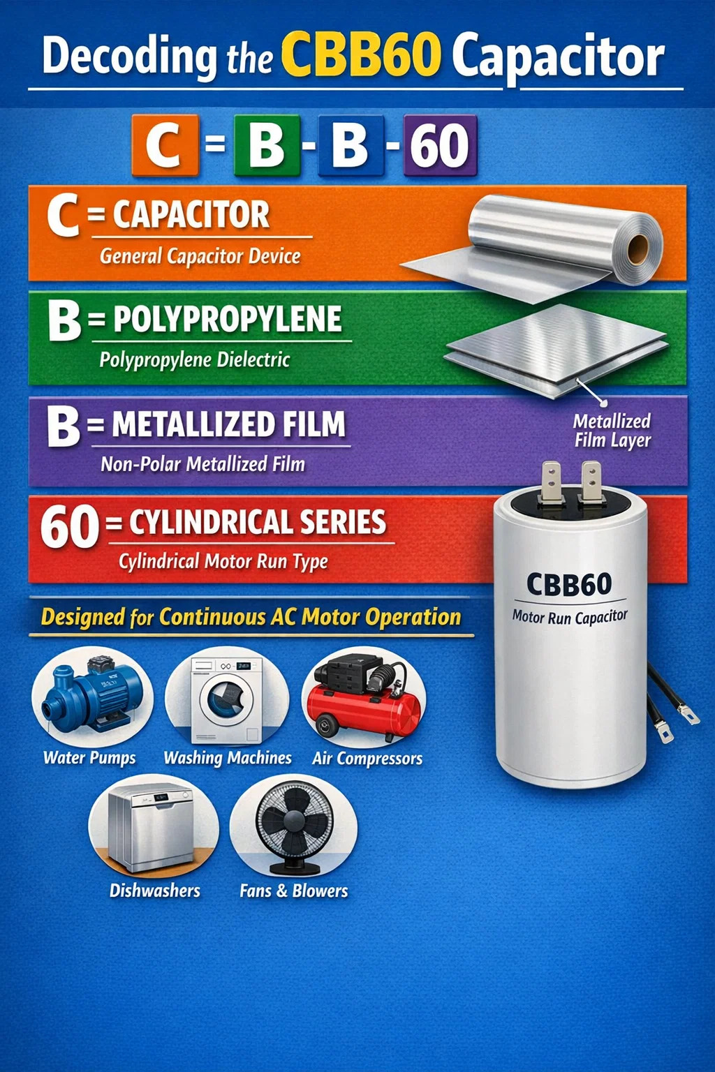 Selve koden er en alfanumerisk forkortelse der hver bokstav har en spesifikk teknisk vekt angående den interne konstruksjonen og bruken av enheten. I motsetning til startkondensatorer som slår ut av kretsen når en motor når hastighet, CBB60 kondensator er bygget for holdbarhet og kontinuerlig elektrisk drift.
