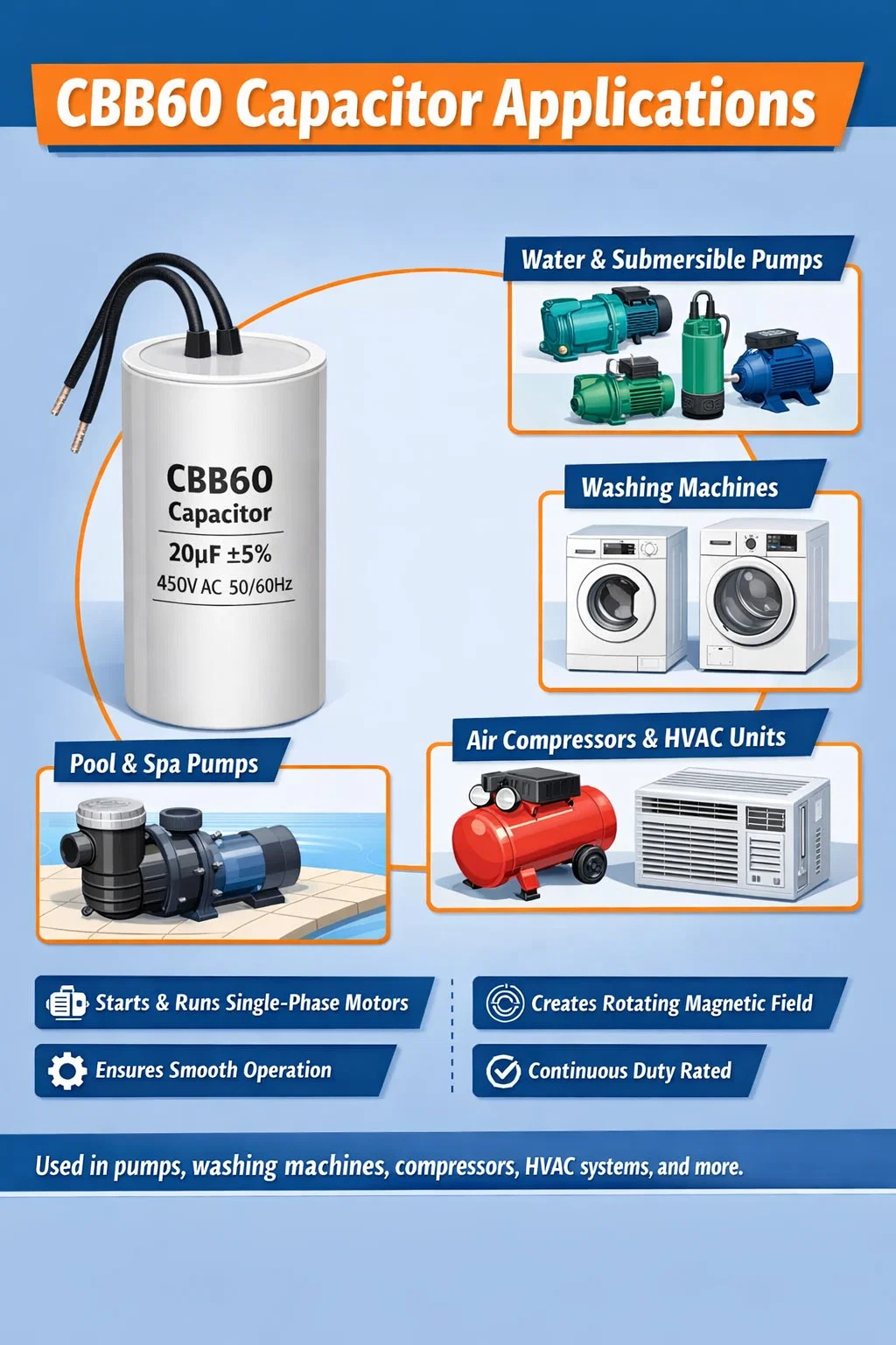 CBB60-kondensatoren vises i et overraskende bredt utvalg av utstyr. Mens pumpeapplikasjoner dominerer markedet, gjør komponentens evne til å håndtere kontinuerlig vekselspenning ved nominell frekvens den egnet der hvor en enfasemotor trenger hjelp til å skape en andre fase.